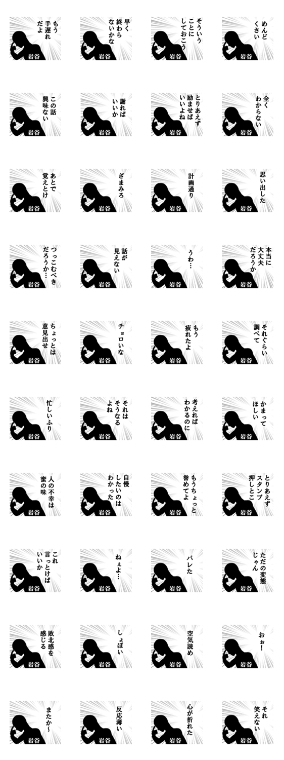 岩谷(いわたに,いわや)専用スタンプです。言いたいけど言えないあなたの本音を代弁します。気軽に毒舌なつっこみができます。