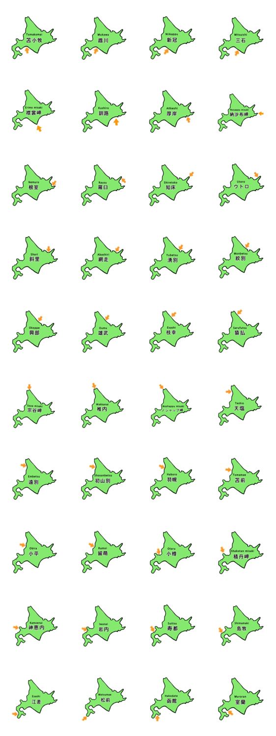 北海道一周旅行に使える地名スタンプです。稚内、知床、根室、釧路、室蘭、函館、小樽など、旅のお供に使ってください。