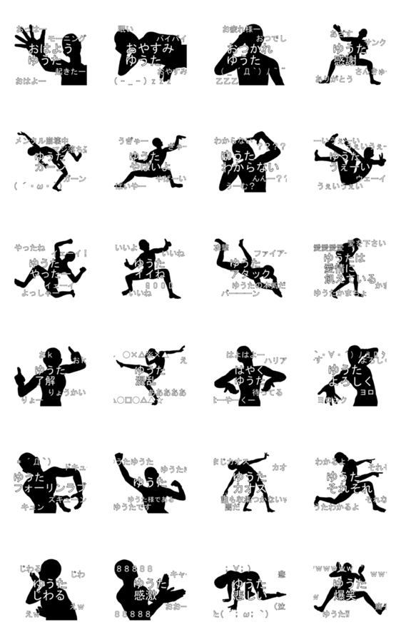 | スタンプ説明 | 動画に流れるコメント風のゆうた専用名前スタンプです。ゆうた,ユウタ,裕太等々。 |
