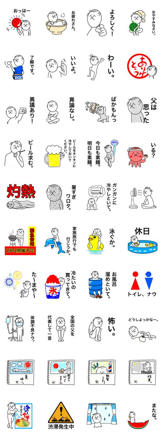 全国のお父さんが毎日の日常で使える、笑いあり、涙ありのスタンプin SUMMERバージョンです☆夏のお父さんが母に、妻に、子に送るスタンプです☆
