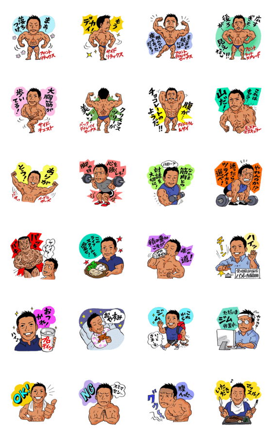 | スタンプ説明 | 骨格筋評論家バズーカ岡田の筋肉迷言やボディビルのポージングで他を圧倒しろ!illustrated by Newrock Yuko, prduced by M Yuko. |