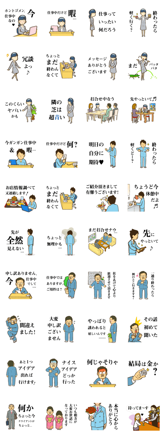 | スタンプ説明 | 仕事中、仕事関係、忙しいふり用にも是非!多忙なあの人へのプレゼント、就職祝いにも最適! |