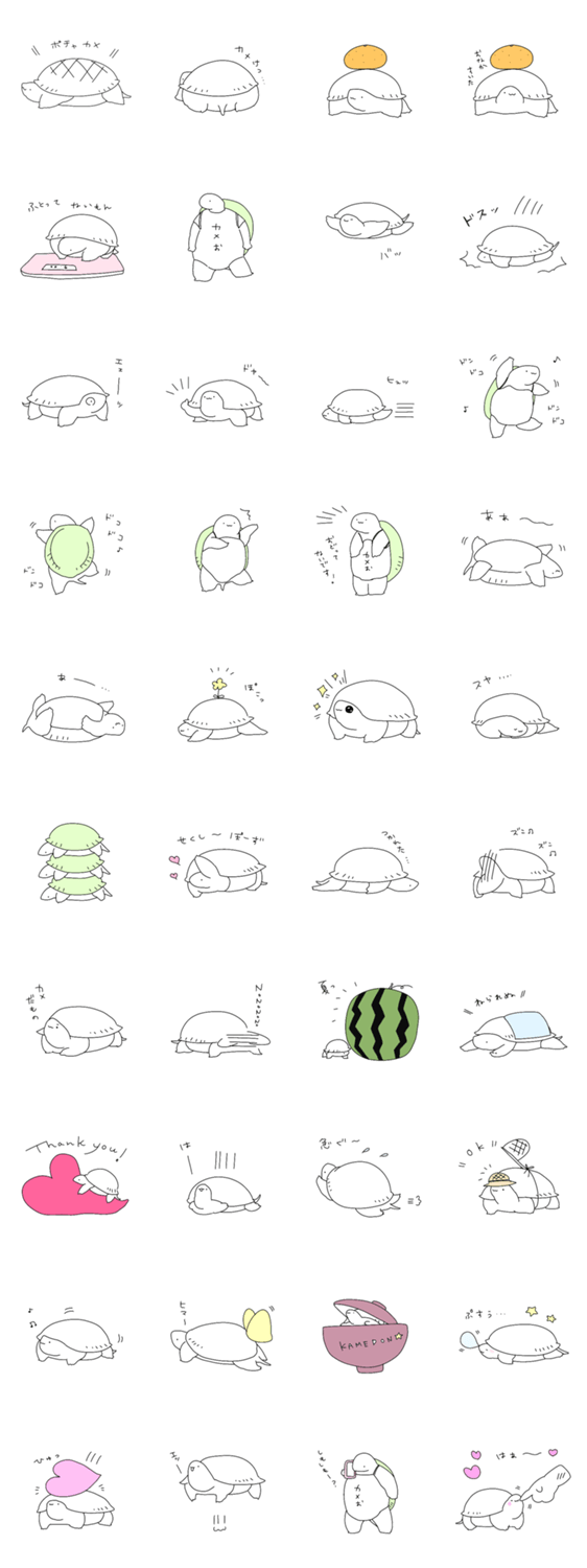 カメのスタンプです。日常から様々な場面にカメおが登場。ギョーザじゃないよ甲羅だよ。