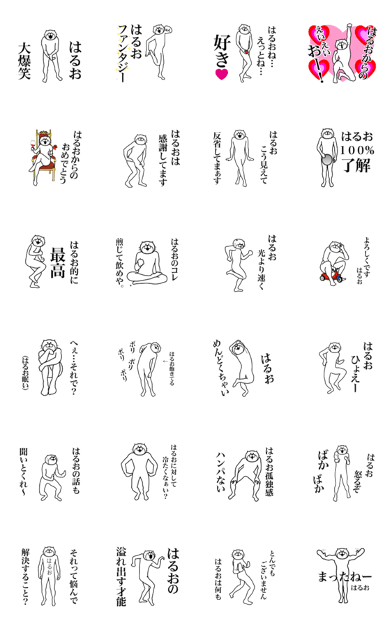 はるおくんが使える面白い動く名前スタンプ♪春雄.春男.晴夫.春夫.春生.晴男.晴生.晴郎.治夫.晴雄.玄雄.治雄.治男.春音.春於.東男.偆夫など世界中のハルオさんに届け!