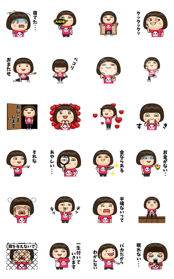 | スタンプ説明 | はあちゅうがデザインした『ブロガーパンダ』のプリントTシャツを着た女の子の第2弾♪パンダ好き、ピンク好き必見!芋ジャージのくーが×ブロガー・作家はあちゅう |