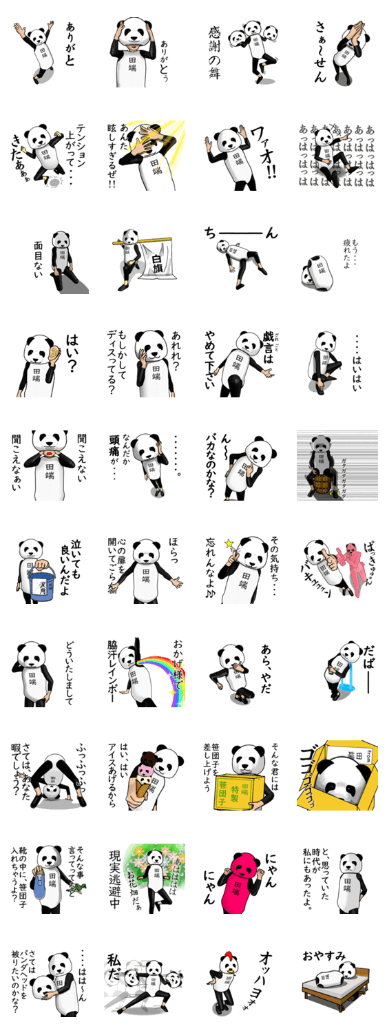 | スタンプ説明 | パンダの着ぐるみ姿の名前・名字スタンプ第2弾。たばた,たはし,たはた,たばし,たばな,たぶちさん等に |