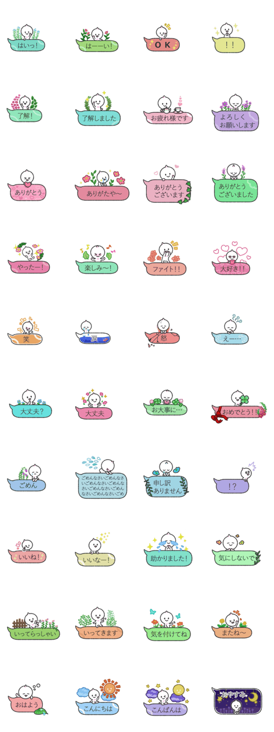 とんがりあたまの「つつん」吹き出しバージョンです! 「了解」「はい」「ありがとう」など、よく使う言葉が多く入っています。花や葉っぱなどのイラストで和みをプラス♪