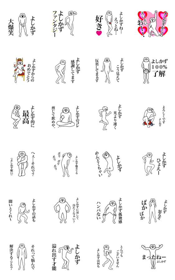 よしかずくんが使える面白い動く名前Stamp♪義一.喜一.良和.良一.善一.慶一.義和.好和.泰和.美一.嘉和.由和.至一.圭一.凱紀.喜和.佳和.芳一.芳和.慶和などヨシカズさんへ!