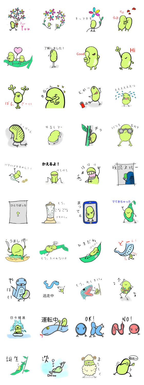 空豆から生まれたカエル、彼の名前はkelog(ケロッグ)。そんな彼の日常をスタンプにしてみました。シュールだけど何かかわいいスタンプで楽しんでください。