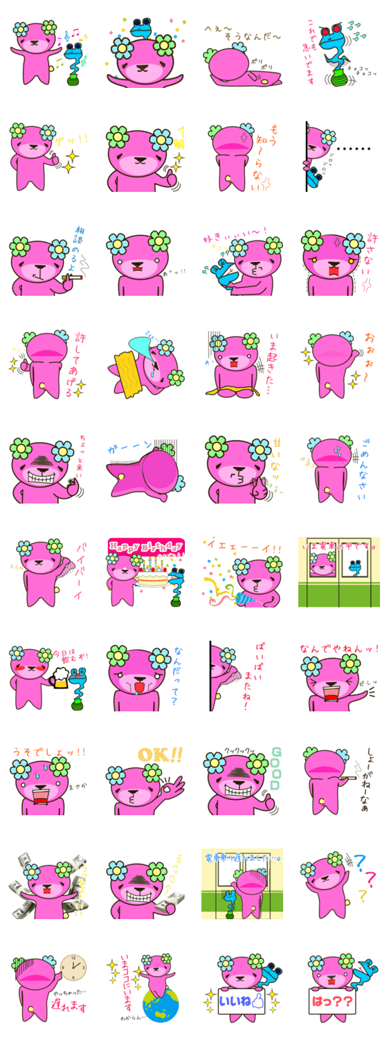 | スタンプ説明 | お花の妖精!?不思議な花くまがへび壺君と一緒にあなたの日常に花を添えます♪表情豊かなくまちゃんです!みなさんかわいがってあげてください♪ |