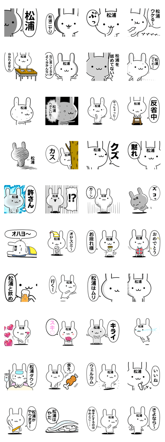 | スタンプ説明 | 日本全国の苗字の中,松浦サンの人気毒舌吹き出しうさぎスタンプ!面白く,ウザく,名前が,まつうらサンに使える!マツウラさん,マツウラちゃん,マッちゃんへ♡ |