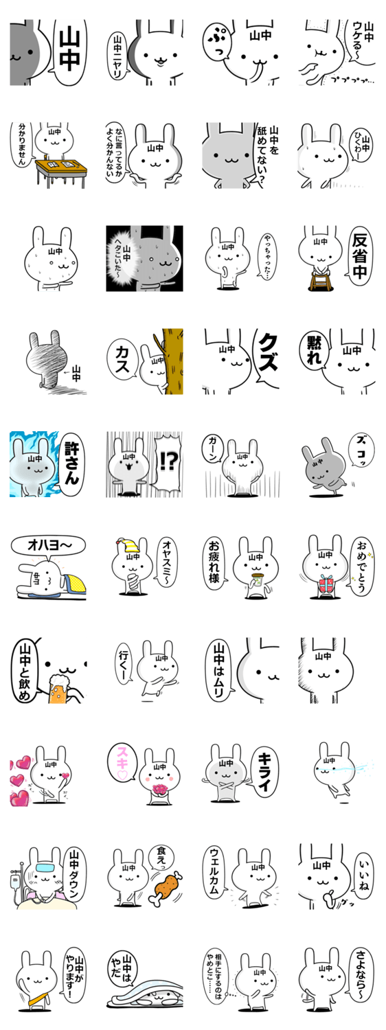 | スタンプ説明 | 日本全国の苗字の中,山中サンの人気毒舌吹き出しうさぎスタンプ!面白く,ウザく,名前が,やまなかサンに使える!ヤマナカさん,ヤマナカちゃん,ヤマちゃんへ♡ |