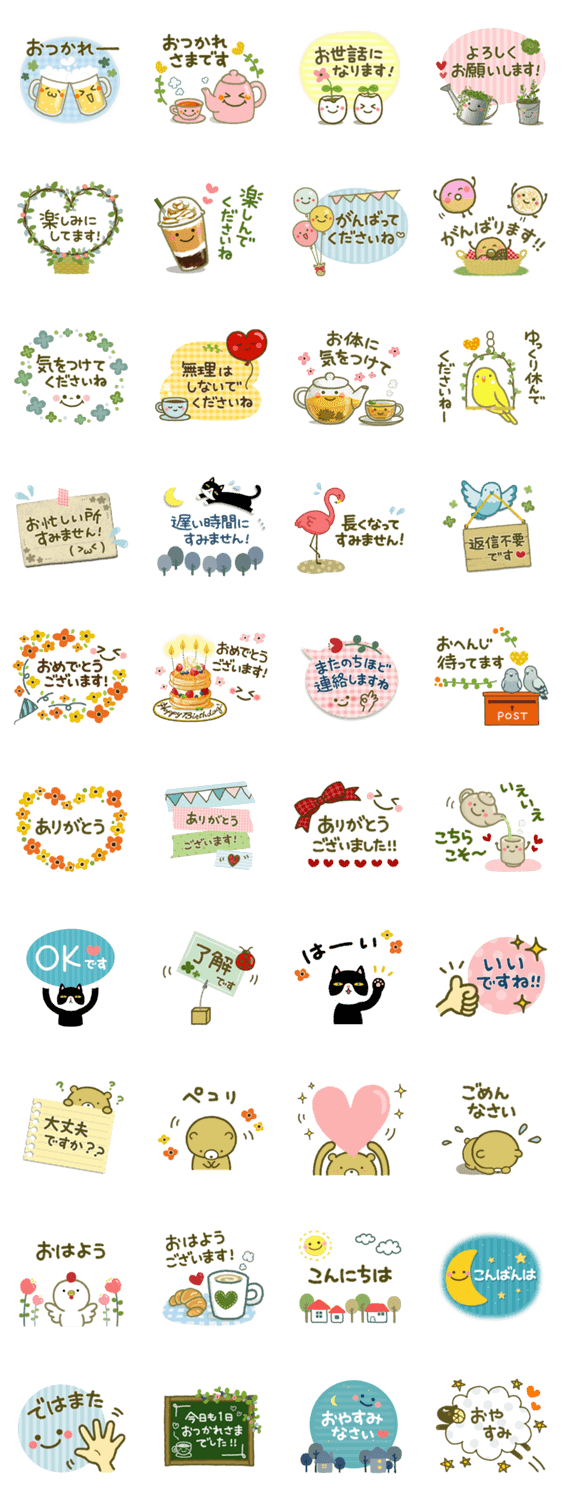 大人女子のためのスタンプ♪やさしく気づかいのできるフレーズや、日常会話で使える、ていねいな敬語です。くま、ねこ、鳥もいます。