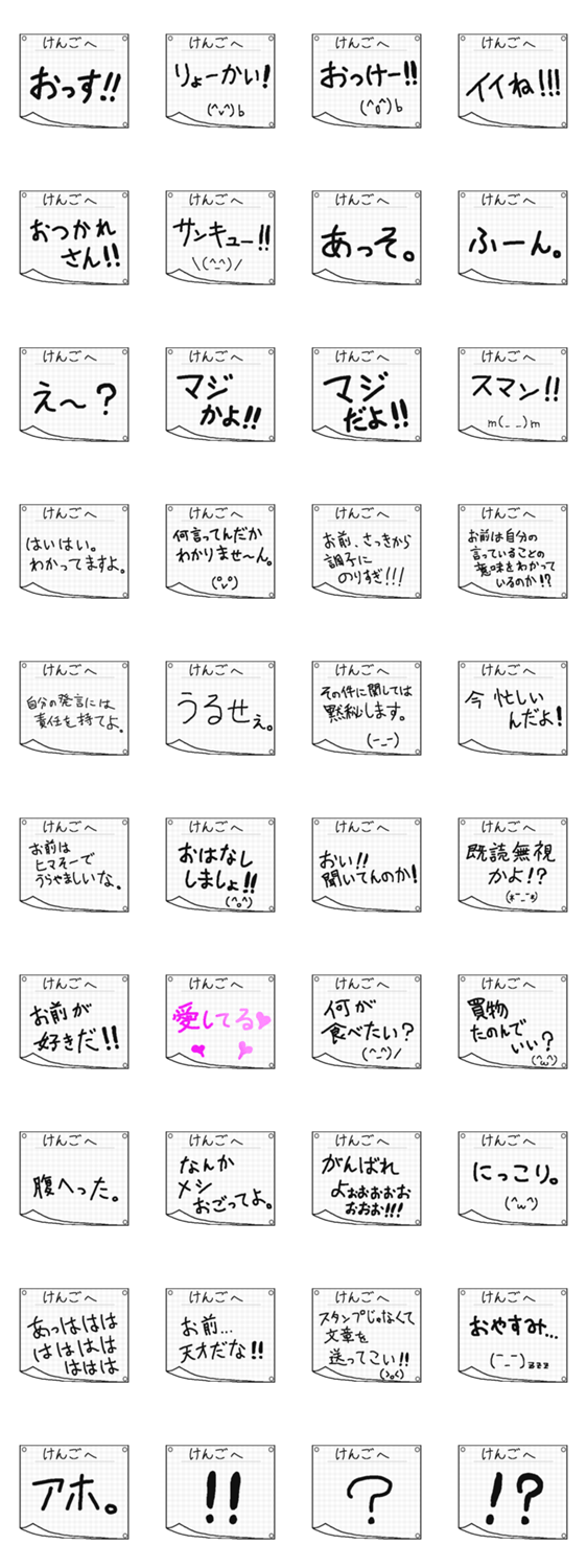 | スタンプ説明 | けんごへ送る専用のメモ帳風名前スタンプ。健吾/研吾/賢吾/謙吾/健五/健午/健悟/兼悟/剣吾/建吾/賢護/顕吾/Kengo/けんちゃん/ケンゴ。無難な面白いシュール。顔文字。 |