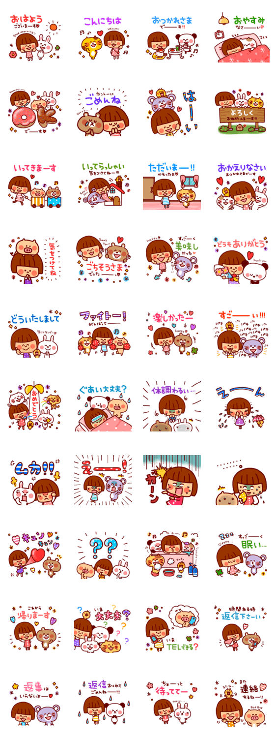 とっても使いやすいおかっぱちゃんと動物たちのかわいい毎日使えるスタンプ♪挨拶やあいづちなどたくさん★グラフィックデザイナー【たかせゆづき】スタンプ