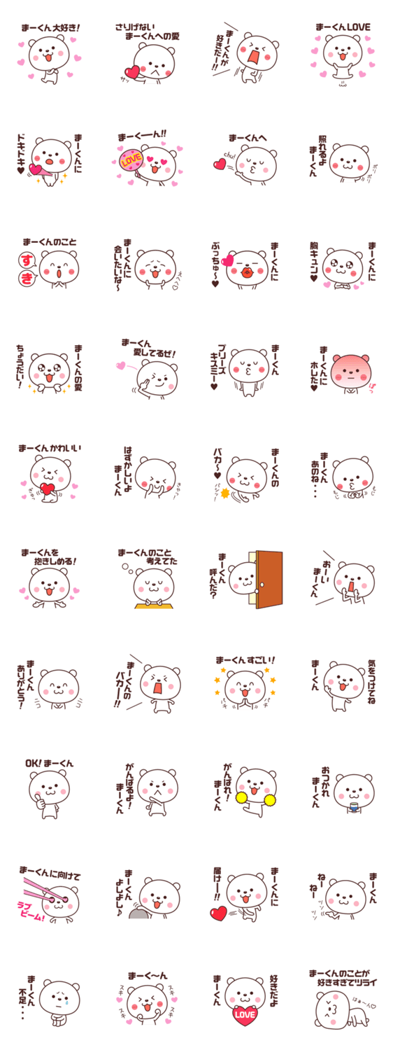 | スタンプ説明 | 大好きなまーくんに送る名前スタンプ。 大切な人にLOVEな気持ちを伝えよう♡ (まさ、まさと、まさひろ、まさゆき、まさかず、まさし、まなぶ、松本、マサ、マー等) |