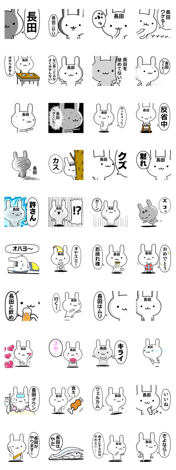 | スタンプ説明 | 日本全国の苗字,長田サンの人気毒舌吹き出しうさぎスタンプ!面白く,ウザく,名前が,ながだ・ながた・おさだ・おさたサンに使える!オサダさん,ナガタちゃん,ナガちゃんへ♡ |