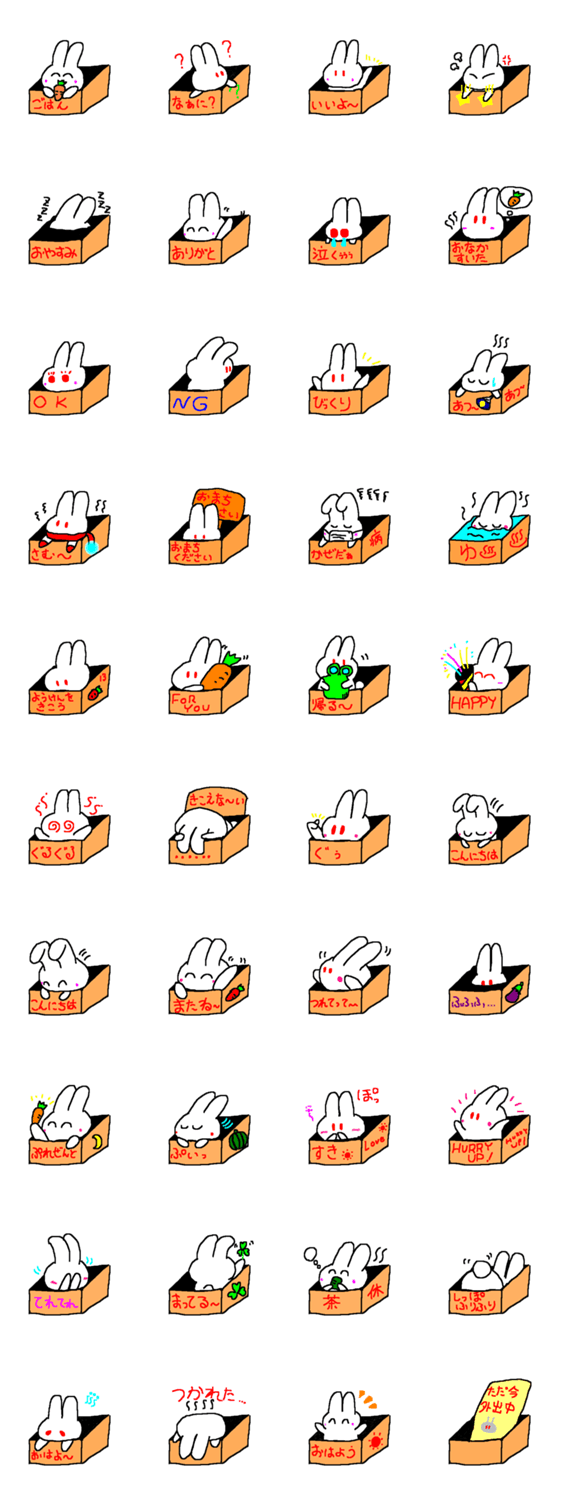 | スタンプ説明 | 知ってる人は知っているあのたぶんうさぎのスタンプが登場!今回は箱に入ったうさぎさんです。だれか可愛がってやってください。 |