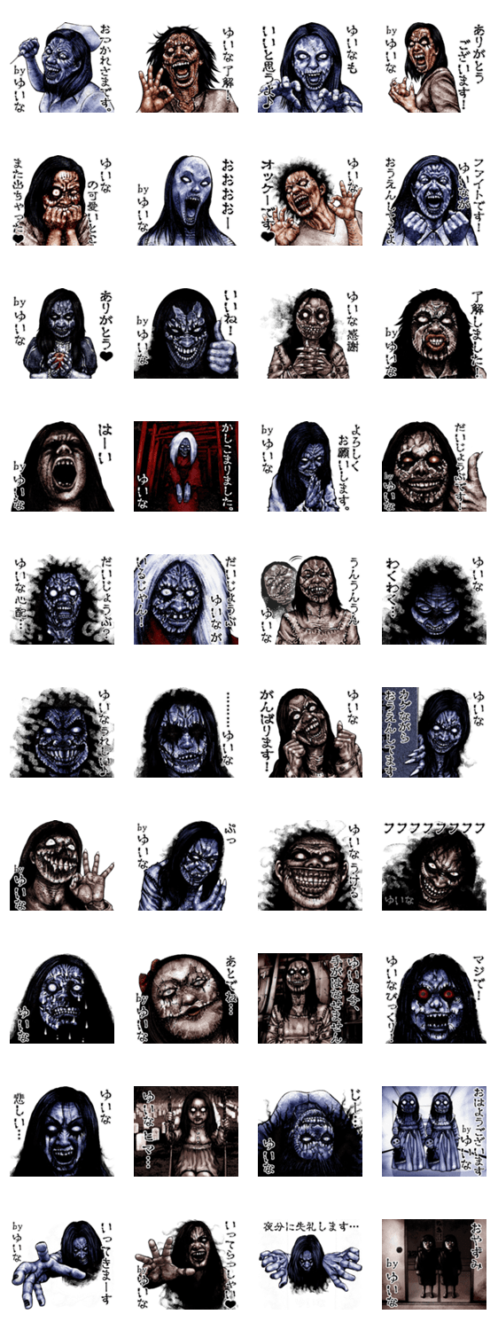 | スタンプ説明 | 見た目が恐くてゾンビや幽霊、怨霊、ホラー顔だけど、本当は心優しい、ユイナさん専用、強面(コワモテ)ゾンビ ホラースタンプです。身近な ゆいなさんへのプレゼントにも |