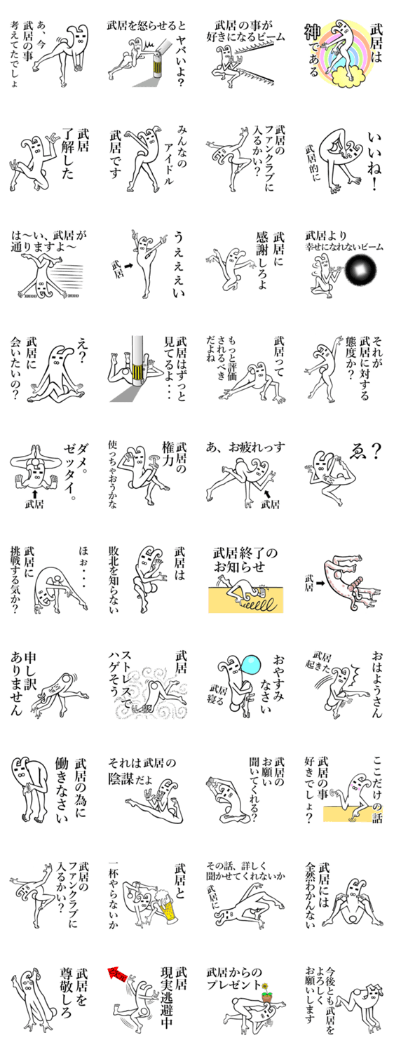 | スタンプ説明 | 名前が【武居/たけい】さんのスタンプ。武居/タケイ/たけちゃん/タケチャン/武居君/たけすえくん/タケスエクン/たけっち/タケッチ/たけりん/タケリン/たけるん/さんへ。 |