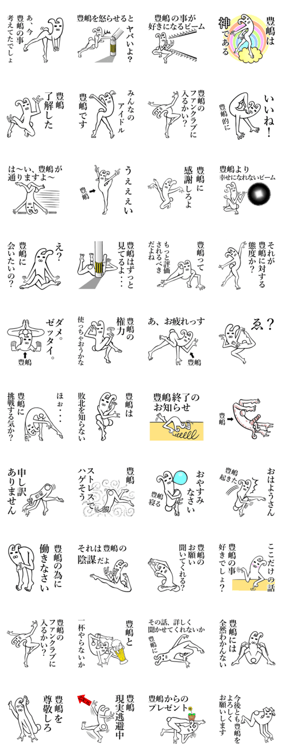 | スタンプ説明 | 名前が【豊嶋/とよしま】さんのスタンプ。豊嶋/トヨシマ/とよちゃん/トヨチャン/豊嶋君/とよじまくん/トヨジマクン/としま/トシマ/とよっち/トヨッチ/とよりん/さんへ。 |