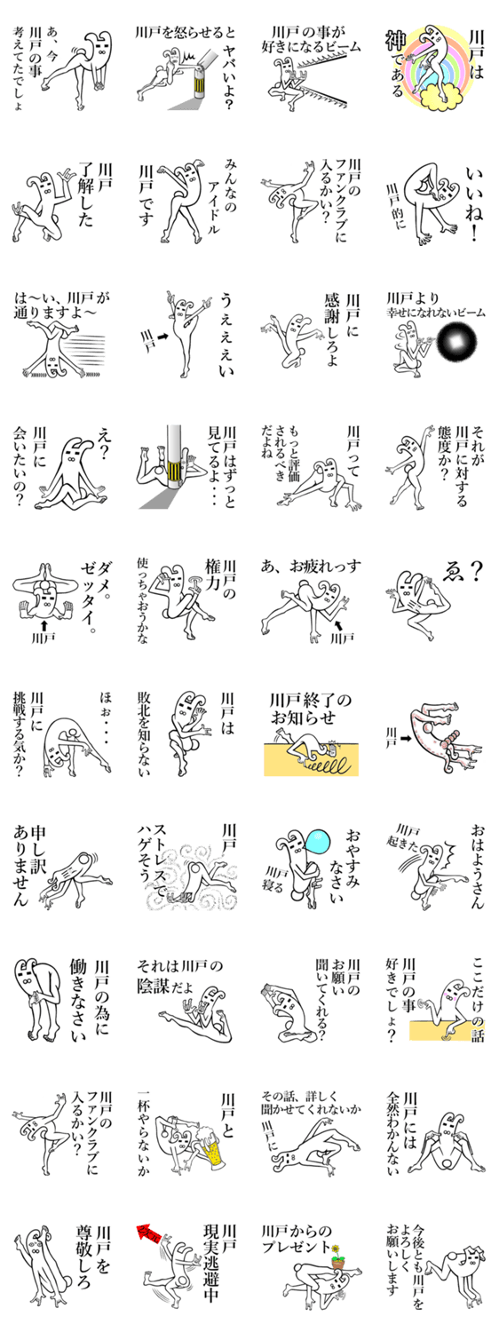 | スタンプ説明 | 名前が【川戸/かわと】さんスタンプ。川戸/カワト/かわちゃん/カワチャン/川戸君/かわどくん/カワドクン/かわっち/カワッチ/かわべ/カワベ/かわしー/カワシー/子猫旅館 |