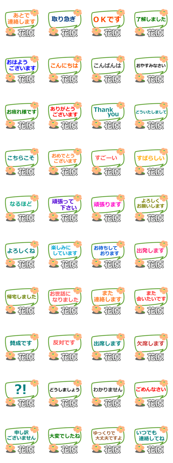 | スタンプ説明 | はなはら,はなばら,はなわら,とり急ぎ,取り急ぎ,とりいそぎ.緊急.基本挨拶等,丁寧な日常会話,連絡用【父母,子供の日,親孝行】プレゼント用にもお薦め簡単大きな文字 |