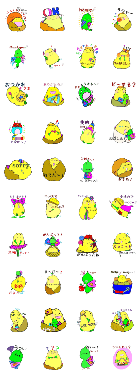 | スタンプ説明 | ほっこり、のんびりのじゃがバター君! & しっかり者のインコのピー! 見る人に、小さな微笑みをあたえてくれます。 |