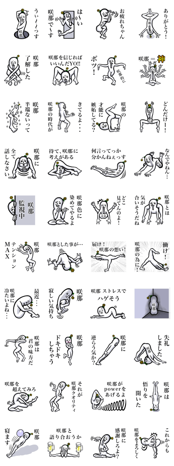 | スタンプ説明 | 名前が【咲那】さんスタンプ。咲那/さな/サナ/えみな/エミナ/さなちゃん/サナチャン/咲那君/えなくん/エナクン/らな/ラナ/さなりん/サナリン/さなしー/サナシー/なぽぴらふ |