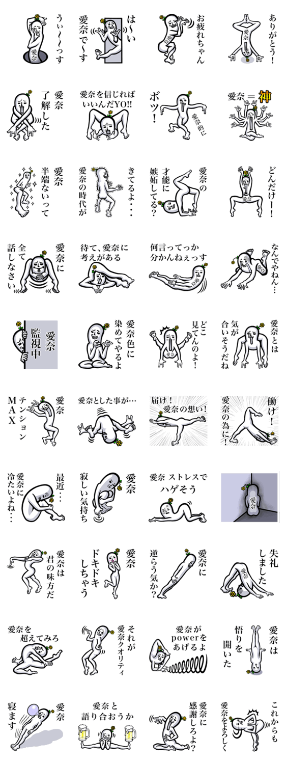 | スタンプ説明 | 名前が【愛奈】さんスタンプ。愛奈/あいな/アイナ/まな/マナ/あいちゃん/アイチャン/愛奈君/えなくん/エナクン/いとな/イトナ/あいりん/アイリン/まなしー/なぽぴらふ |