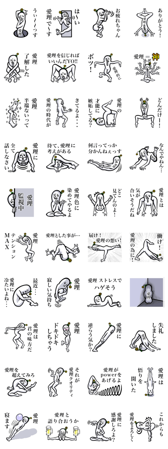 | スタンプ説明 | 名前が【愛理】さんスタンプ。愛理/あいり/アイリ/えり/エリ/あいりちゃん/アイリチャン/愛理君/まなりくん/マナリクン/あいっち/アイッチ/えりりん/エリリン/なぽぴらふ |