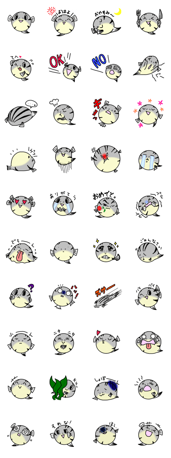 スジモヨウフグのふぐ太郎は、まんまるの体で飛んだり跳ねたり回ったり大忙し。シンプルなスタンプがお好きな方どうぞ!