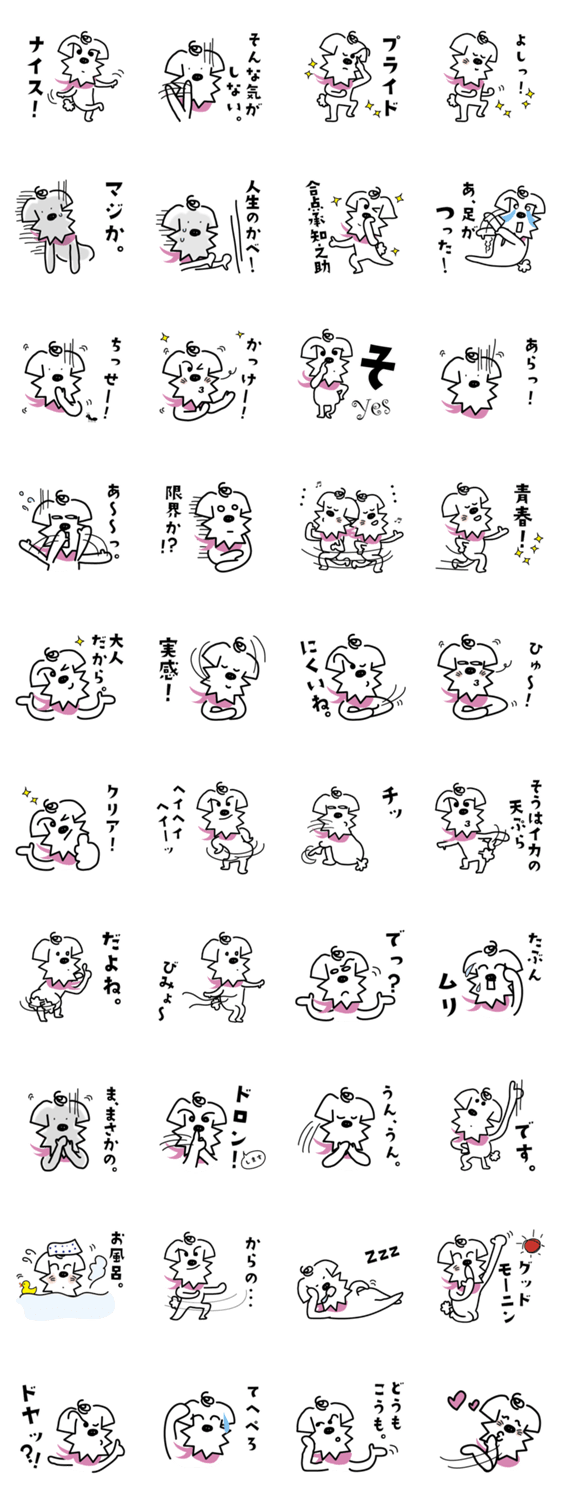 日常生活でよく使う、シンプルで使いやすいスタンプ。かわいいミニチュアシュナウザー犬の癒し系キャラクターがポップでほっこり!それでいてゆるい。