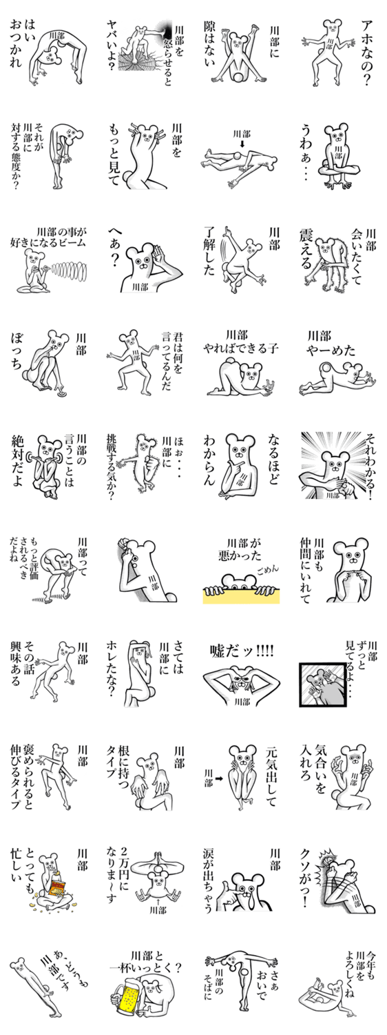 | スタンプ説明 | 名前が【川部/かわべ】さんスタンプ。川部/カワベ/かわちゃん/カワチャン/川部君/かわべくん/カワベクン/かわっち/カワッチ/かわりん/カワリン/かわしー/カワシー/なぽごれ |