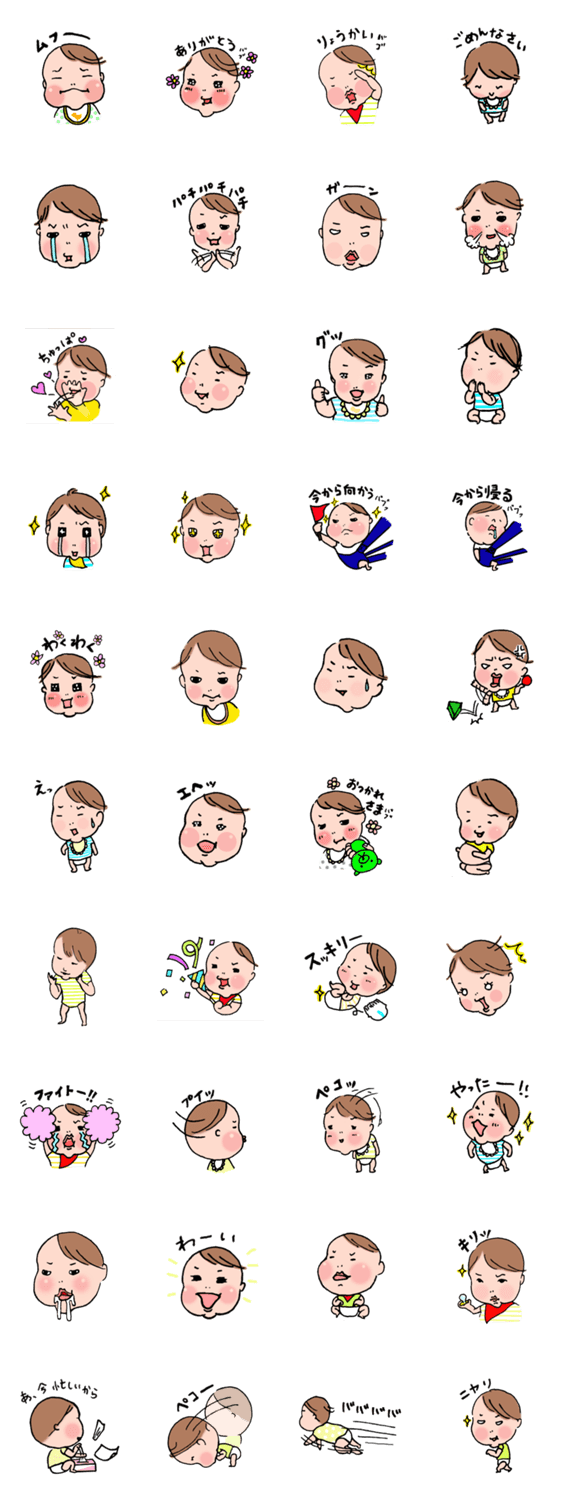 かわいい赤ちゃんです。赤ちゃんならではのしぐさや行動も加えつつ、楽しく使えるスタンプです。