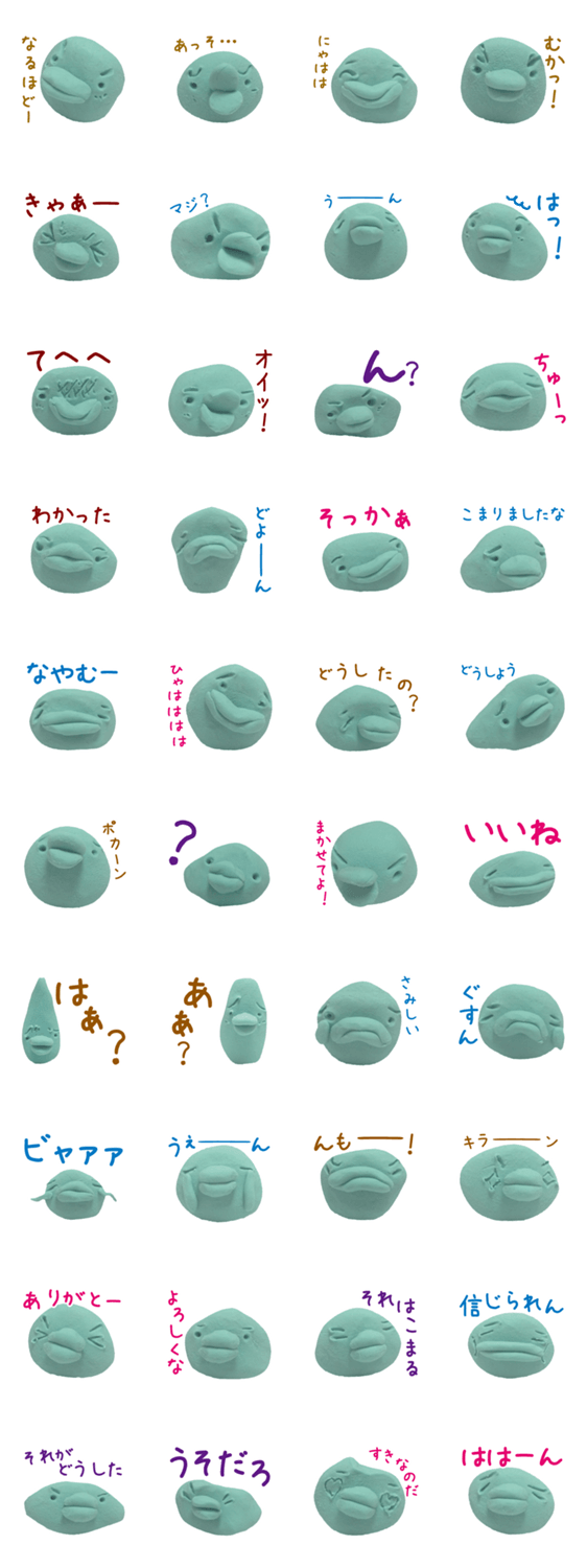 あいづちや様々なリアクションをとる粘土のキャラクターです。くちびる厚めのねんどが笑ったり怒ったり、表情豊かなので話の合間に送るのにピッタリなスタンプです。