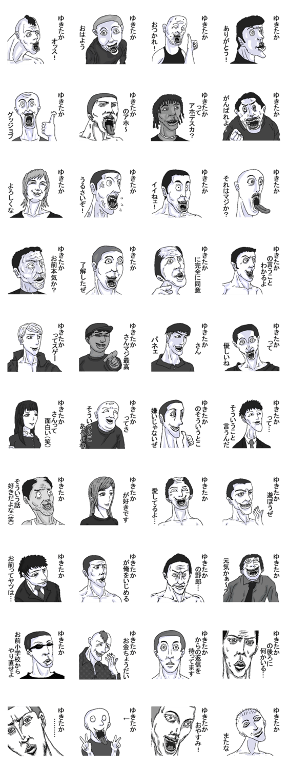 | スタンプ説明 | ゆきたかへ送る専用のうざ顔名前スタンプ。幸隆/行高/之孝/之隆/幸崇/幸応/幸恭/幸敬/幸貴/幸高/幸鷹/行孝/行隆/雪隆/由紀隆/湯木隆/ユキタカ。うざいムカつく面白い変顔。 |