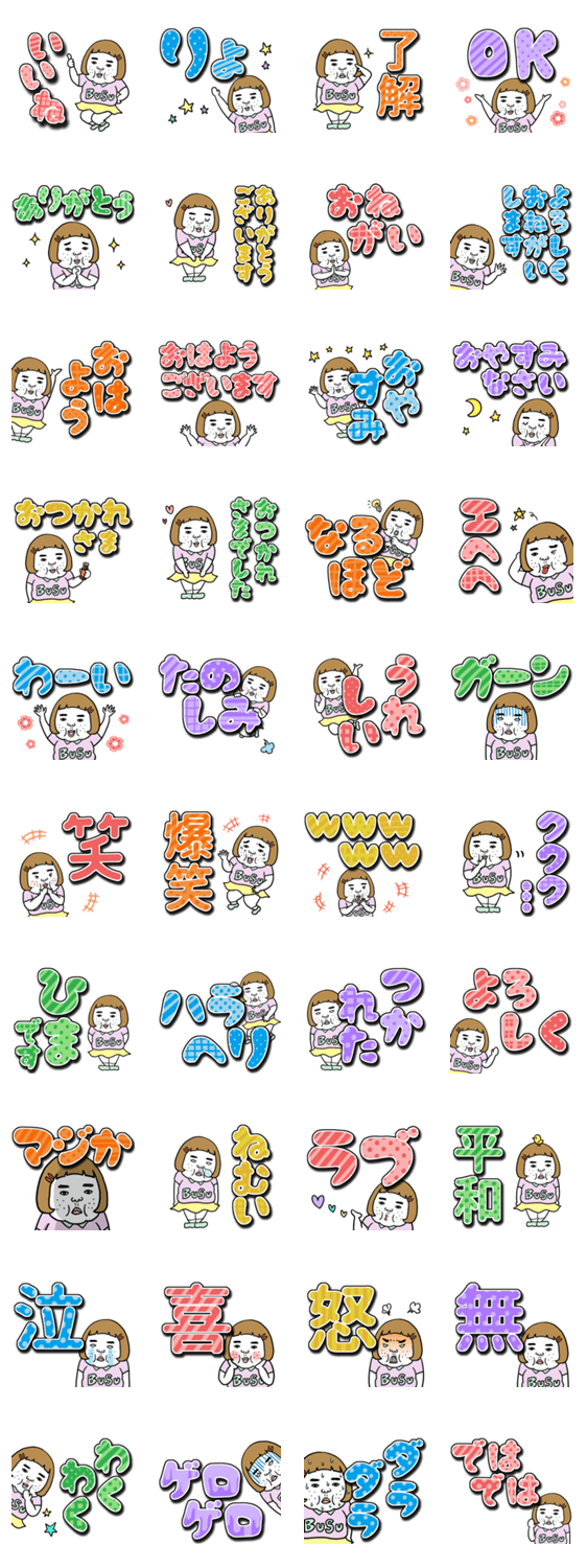 憎めないブスのデカ文字ver.です。大きい文字で見やすく気持ちも伝わりやすいスタンプです。擬音や、立体的で3D感もあります♪ブサイクだけど愛嬌がある自虐ネタスタンプ!