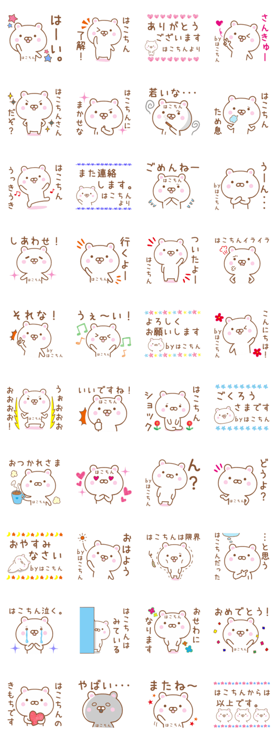 | スタンプ説明 | 【はこちん】さんが使えるクマの名前スタンプです。毎日使いやすいシンプルな基本セットです。はこちん/ハコチン |