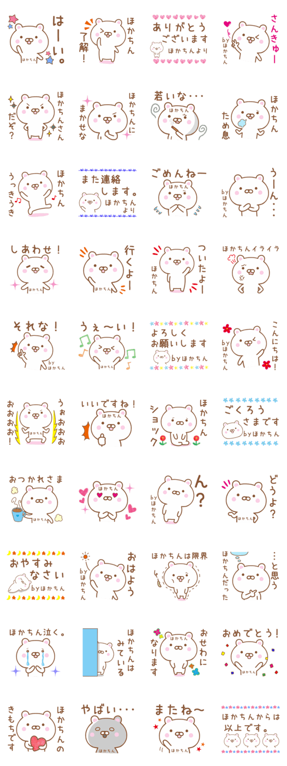 | スタンプ説明 | 【ほかちん】さんが使えるクマの名前スタンプです。毎日使いやすいシンプルな基本セットです。ほかちん/ホカチン |
