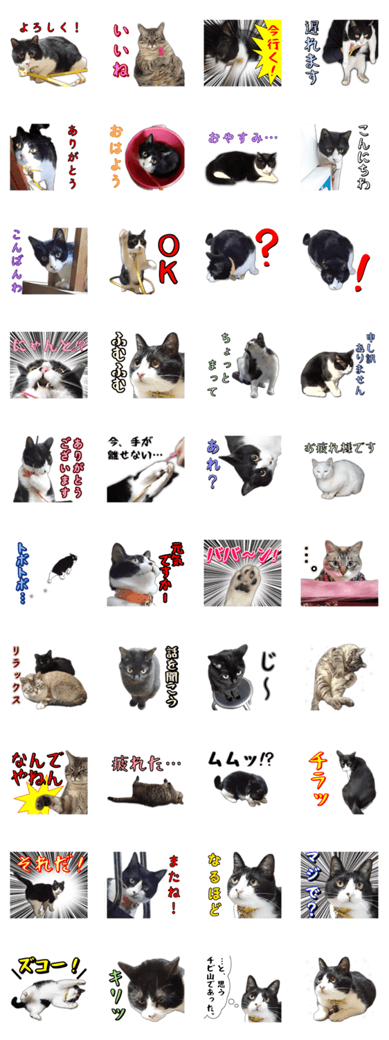 ハチワレ猫のチビ山を始めとした可愛い猫たちのスタンプです。出演:チビ山(ハチワレ)、ソラ(キジトラ)、ゆず(キジトラ)、クロ(黒)、かりん(白)