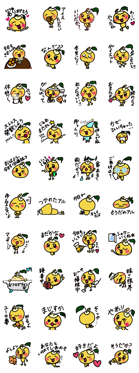 | スタンプ説明 | Creative4Japanプロデュース、高知県生まれのゆず酢のキャラクターゆずだっちぃがついにスタンプに!!可愛らしいゆずだっちぃが文字を打つ時間を短縮してくれます。 |