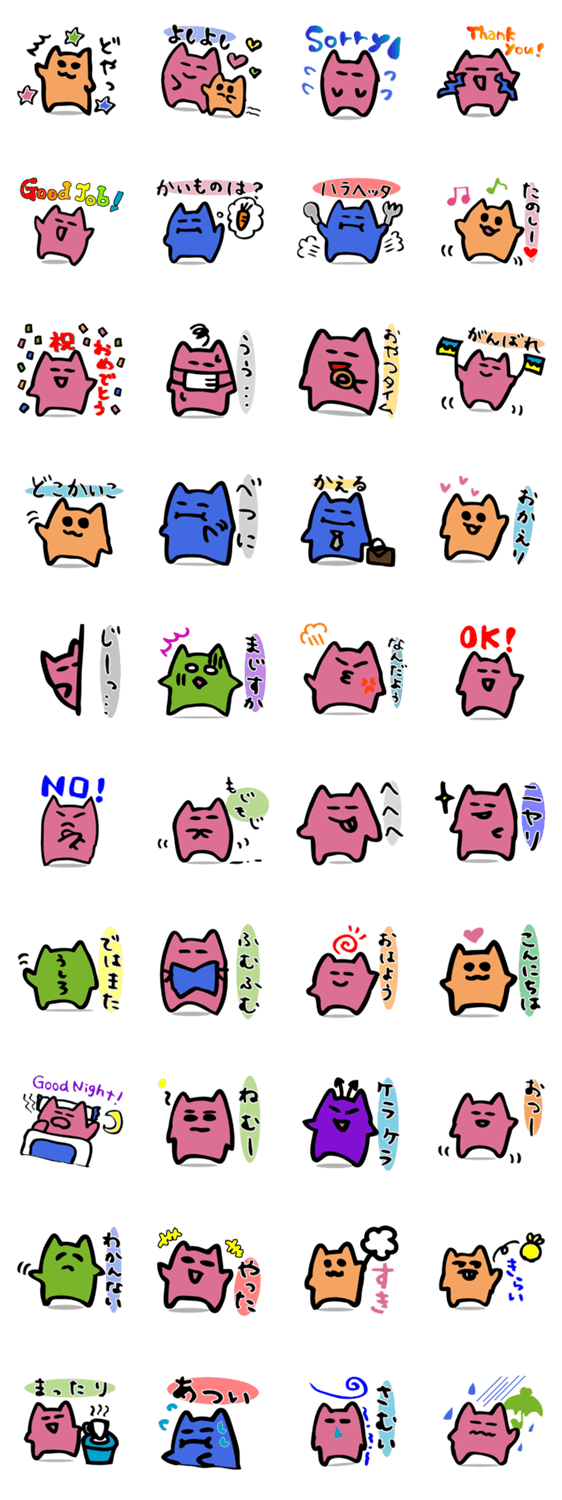 ピンクのよんネコが夫のどすネコや、子どものへうへう達と泣いたり笑ったり。まいにちの生活に使えるスタンプを作りました。
