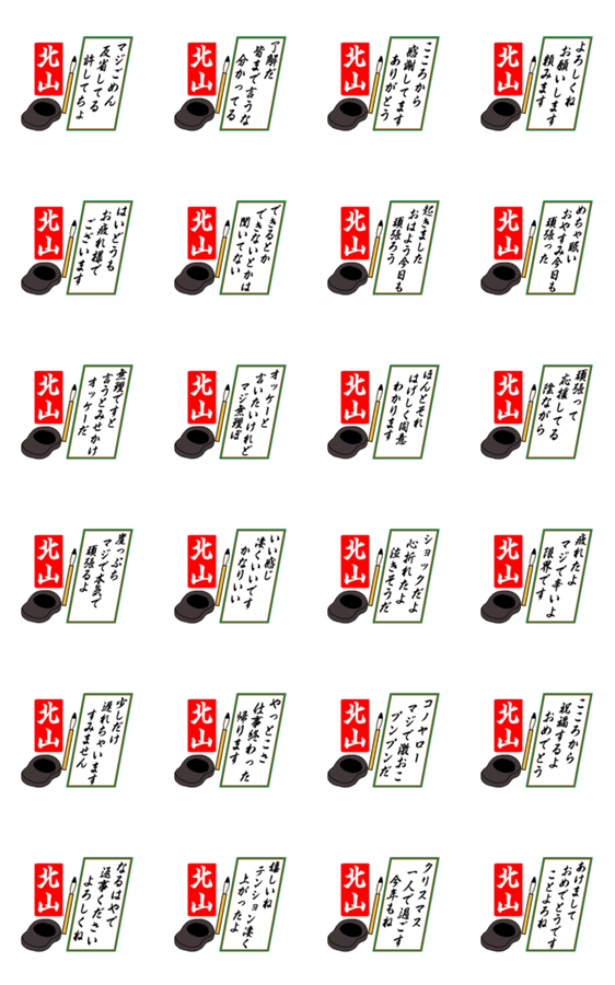 | スタンプ説明 | 北山さんの人が使える きたやま さん専用の川柳や俳句のような575調の名前スタンプです。日常会話の他クリスマスやお正月に使えるスタンプもあります。[ゼンチコ作] |