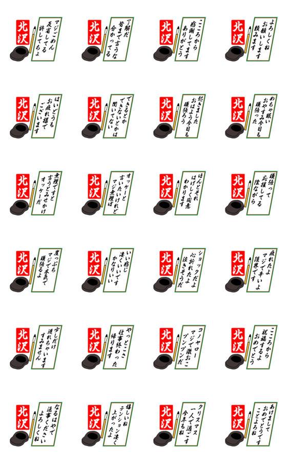 | スタンプ説明 | 北沢さんの人が使える きたざわ さん専用の川柳や俳句のような575調の名前スタンプです。日常会話の他クリスマスやお正月に使えるスタンプもあります。[ゼンチコ作] |