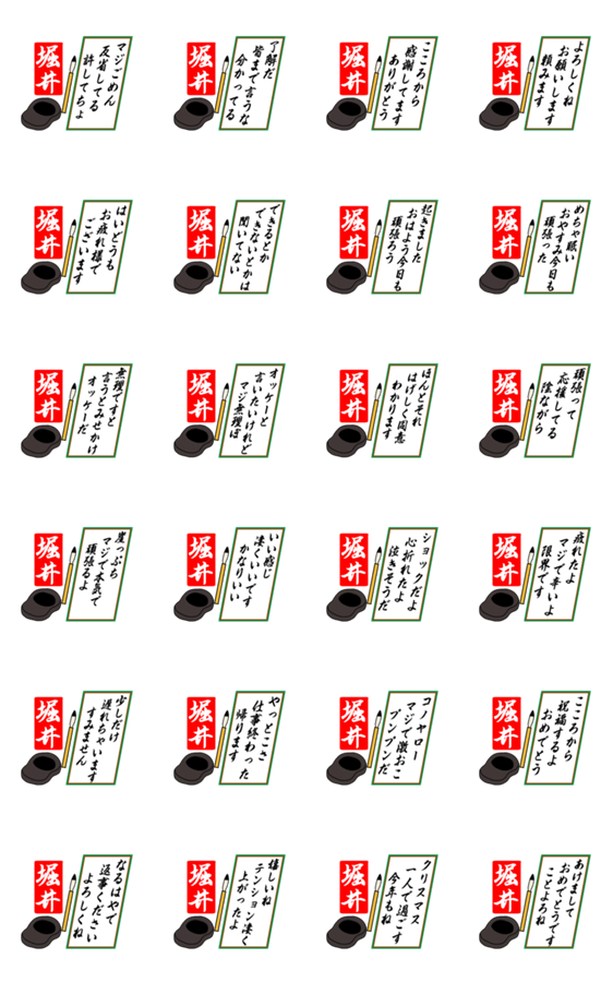 | スタンプ説明 | 堀井さんの人が使える ほりい さん専用の川柳や俳句のような575調の名前スタンプです。日常会話の他クリスマスやお正月に使えるスタンプもあります。[ゼンチコ作] |