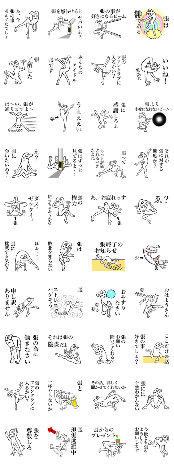 | スタンプ説明 | 名前が【張/ちょう】スタンプ。張/チョウ/ちょうちゃん/チョウチャン/張君/はりくん/ハリクン/ちょっち/チョッチ/ちょーりん/チョーリン/はりっち/ハリッチ/子猫旅館 |
