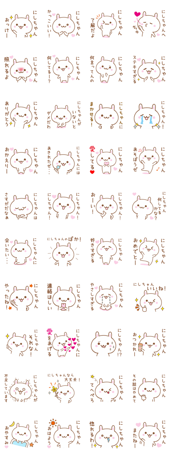 ともだち、家族、恋人など、大切な「にしちゃん」へ送る、ウサギの名前スタンプです。西/西岡/西山/西島