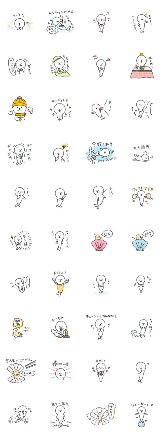 ゆるっと可愛いあざらしと、その友達貝君の手書きスタンプです。ほのぼの。