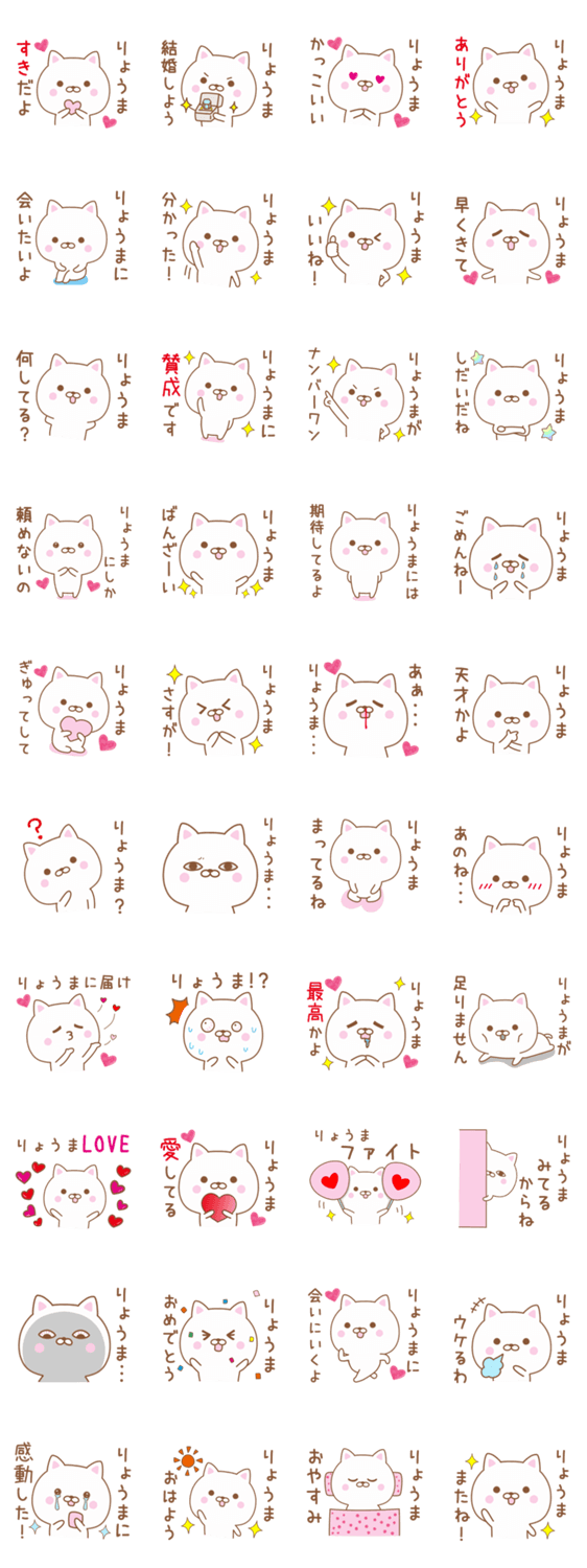 | スタンプ説明 | 「りょうま」さんに気持ちを伝える、猫の名前スタンプです。恋人、友達、家族などに送れます。リョウマ/崚馬/涼真/良真/竜馬/龍馬/涼馬/良磨/両馬 |